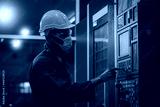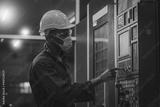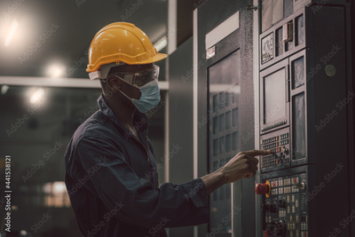 Portrait man worker under inspection and checking production process on factory station by wearing safety mask to protect for pollution and virus in factory.