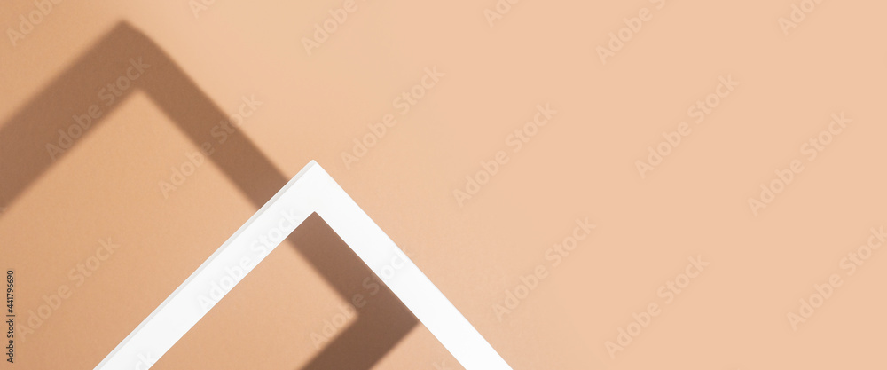 White presentation podium frame on brown background. Top view, flat lay. Banner