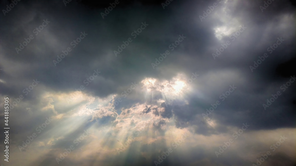 The sky was covered with dark rain clouds and beams of light streaked through the clouds.