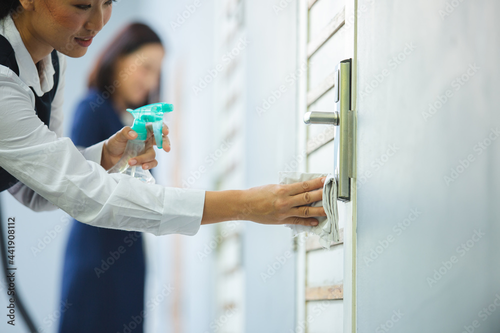 Asian young woman room maid cleaning handle door opener hotel. Prevents infectious diseases from contact, staff bedroom hotel service.