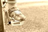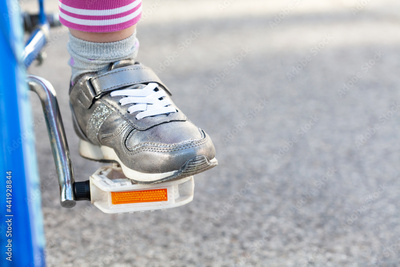 Unrecognizable anonymous child's foot resting on a bicycle pedal, object closeup, little young kid cyclist riding a bike detail shot, healthy active lifestyle abstract concept, leisure, activity