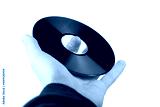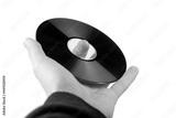 Hand holding up a CD or DVD disc, CD-ROM, DVD-ROM compact digital optical data storage, isolated on white, cut out. Data carriers, storage, storing information, data backup concept, readable surface