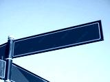 Empty blank blue city street signpost, guidepost, sign post with space for text inside, clear blue sky, nobody. Urban street name simple road sign, guide post object detail, closeup, copy space
