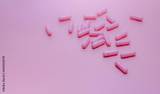 Pink capsules pill on pink background. Vitamins and supplements. Online pharmacy. Pharmacy store banner. Pharmaceutical industry. Woman's health insurance concept. Pills for love and happy life.