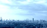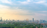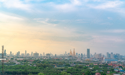 Cityscape of modern building with highway and community in Bangkok. Car driving on elevated bridge. Skyscraper building. Green trees in city. Oxygen for urban life. Eco-friendly city. Urban skyline.