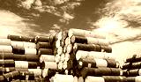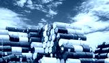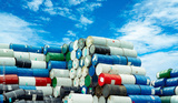 Old chemical barrels. Hazard chemical barrel with warning label. Blue, green, white and red oil drum. Steel oil tank. Toxic waste warehouse. Hazard waste storage in factory. Metal brent oil drum.