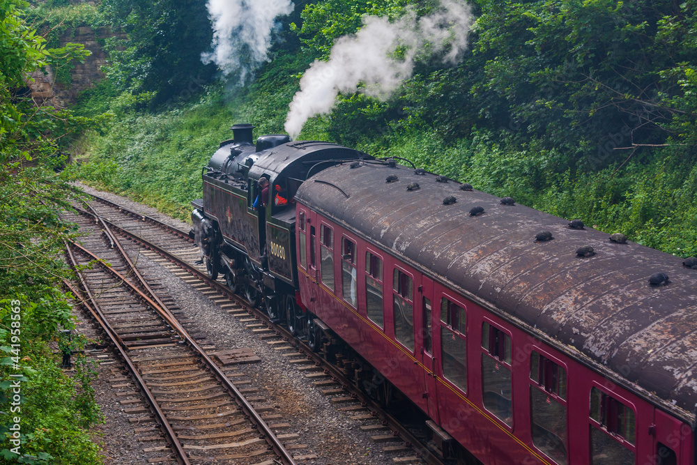 Duffield, Derbyshire, UK, June 22, 2021:Ecclesbourne Railway Steam Railway with Locomotive 80080 departing from Duffield Station on a train service to Wirksworth.