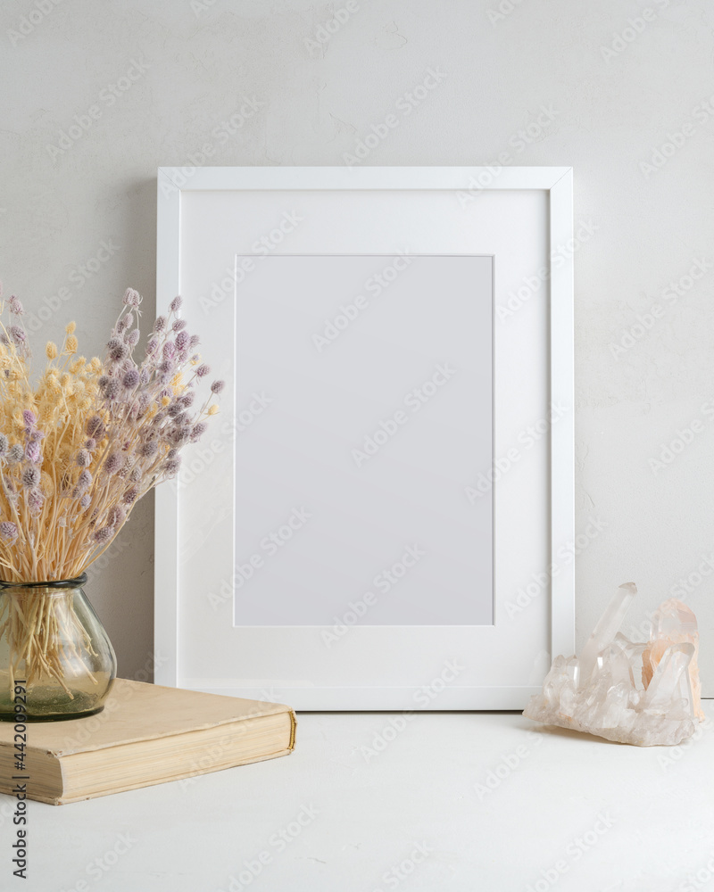 Empty white frame, glass vase with dried flowers, book, and natural crystal in a light interior. Mock up poster with place for your design.