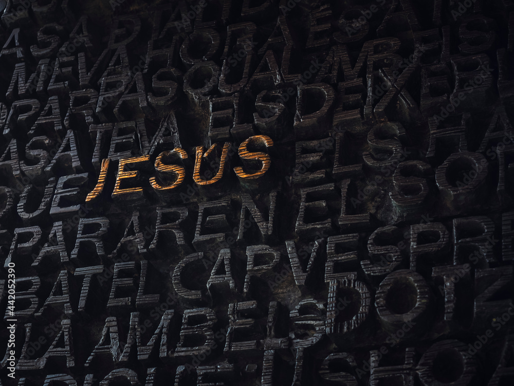 Jesus sign type on wall Black background Religion concept