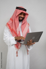 an arabian in a turban smiling while using a laptop computer on a plain background