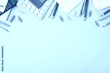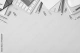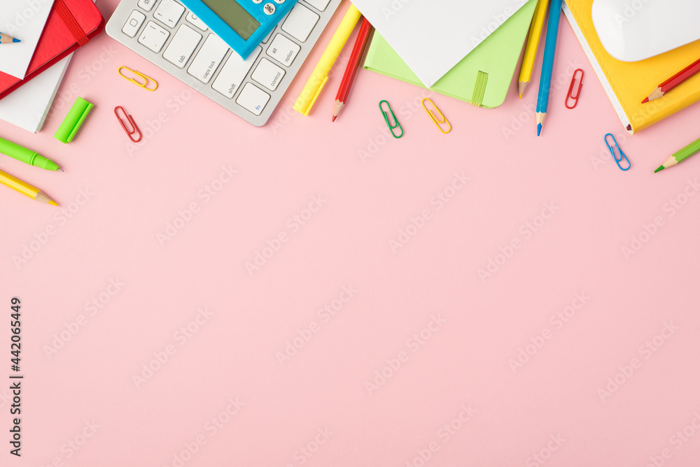 Top view photo of keyboard mouse multicolor pencils pens clips red green and yellow diaries and calculator on isolated pastel pink background with copyspace