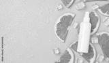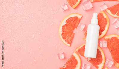 Top view photo of white spray bottle without label on half slices of grapefruit ice cubes and drops on isolated pastel pink background with copyspace