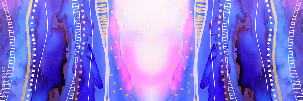 art photography of abstract fluid painting with alcohol ink, blue, purple and gold colors