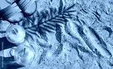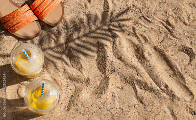 Bright summer beach vacation or travel lifestyle concept flat lay with lemonade and a flip flops on the sand. Top view. Copy space