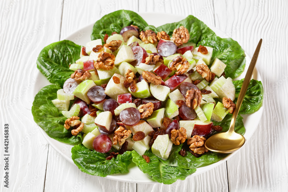 Waldorf salad with red grapes on a plate
