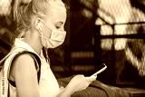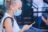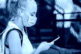 Beautiful caucasian woman blond hair white skin wear face mask and earphone using smartphones.