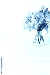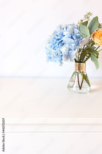 Bouquet with Blue Hydrangea flower and roses in the glass vase. Floral composition