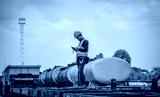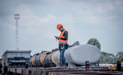 Engineer under inspection and checking construction process railway switch and checking work on railroad station .Engineer wearing safety uniform and safety helmet in work