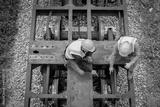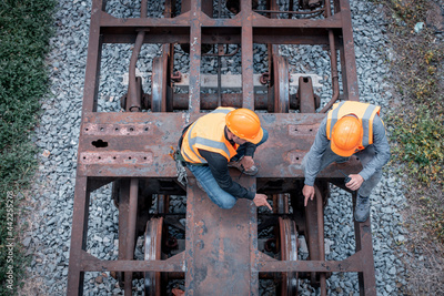 Engineer under inspection and checking construction process railway switch and checking work on railroad station .Engineer wearing safety uniform and safety helmet in work