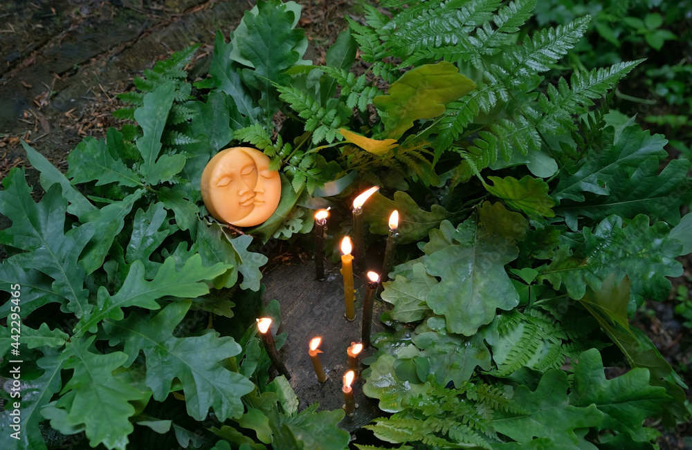 Burning candles, symbolic moon, oak and fern leaves on natural background. old pagan, Wiccan, Slavic traditions. Witchcraft, esoteric ritual for Summer Solstice Day, Midsummer, Litha sabbath
