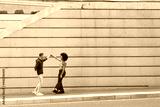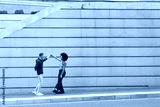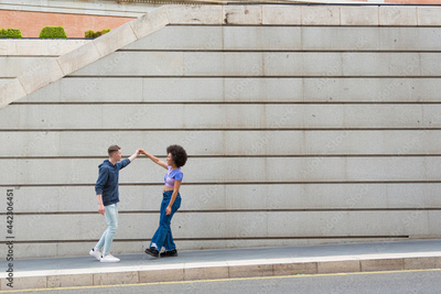 young couple Caucasian man and African American woman having fun around city with blue casual clothes and a gray wall