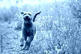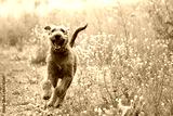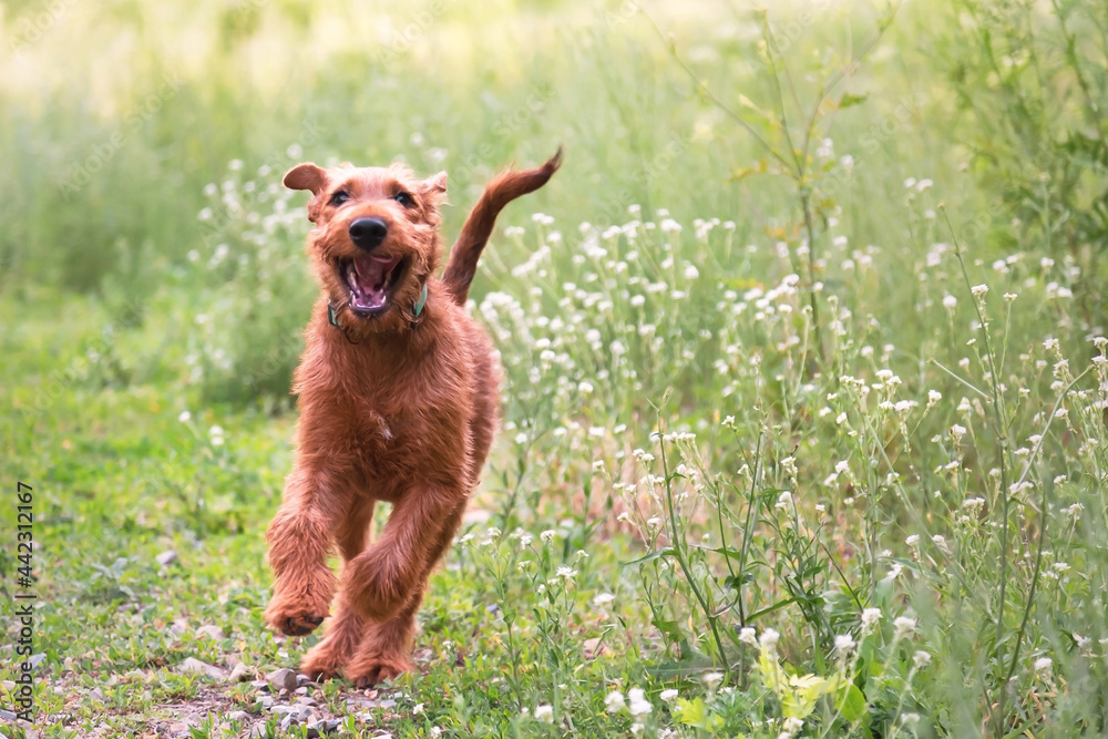 Young Irish Terrier dog in motion in the summer in the grass in nature outdoors, domestic purebred pet red-haired puppy runs and plays with a satisfied, happy smiling muzzle