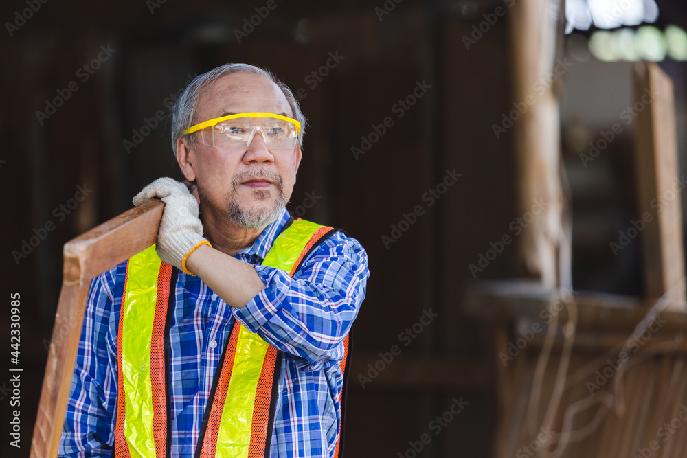 asian senior man carpenter working at workspace. craftsman profession in wood factory.