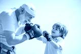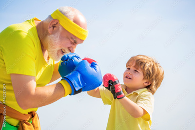 Little boy doing boxings exercise with grandfather. Father is training his son boxing. Little boy sportsman at boxing training with coach. Sports man coaching boxing little boy in red boxing gloves