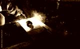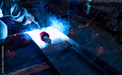 Welder welding metal with argon arc welding machine and has welding sparks. A man wears protective gloves. Safety in industrial workplace. Welder working with safety. Worker in steel industry factory.