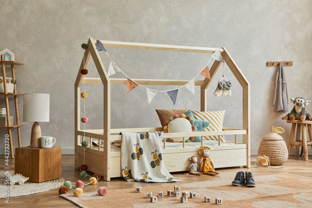 Creative composition of cozy scandinavian child's room interior with wooden furniture, plush and wooden toys and textile hanging decorations. Neutral creative wall, carpet on the floor. Template.