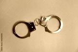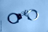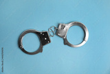 Classic chain handcuffs on light blue background, top view