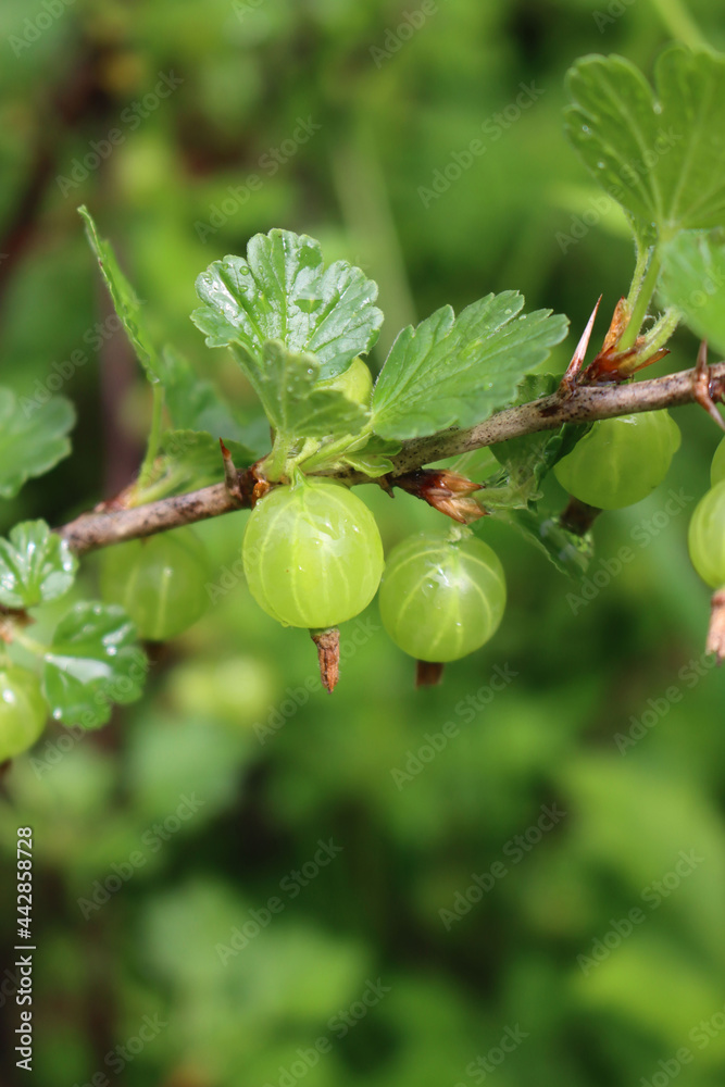 Unripe green gooseberry fruit on a branches on a sunny day . Ribes uva-crispa on summer