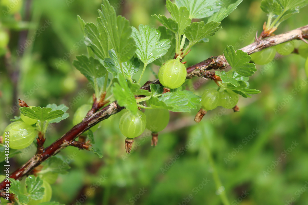 Unripe green gooseberry fruit on a branches on a sunny day . Ribes uva-crispa on summer