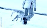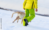 Female legs and dogs paws running in sparkling snow