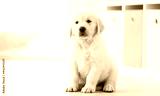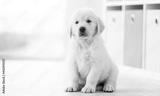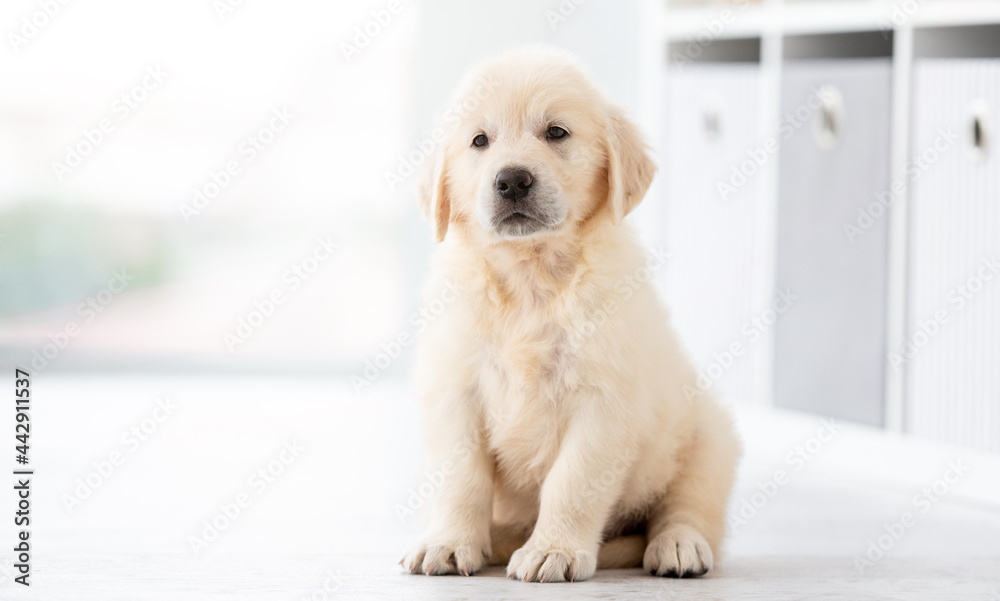 Funny retriever puppy sitting on floor at home