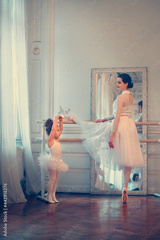 Adult ballerina is teaching a little one. Image with selective focus, noise effect and toning