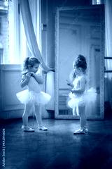 Funny little ballerinas is eating chocolate in the ballet class and the other one is looking at her. Image with selective focus, toning and noise effects.
