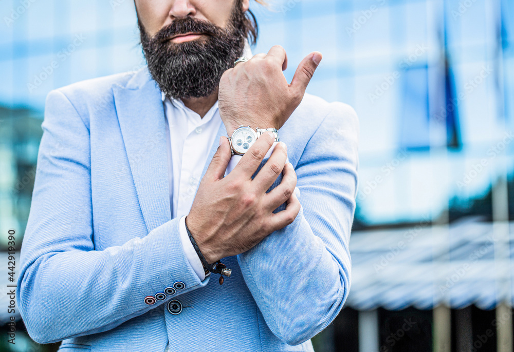 Watch in a man. Businessman points to his watch on the background of the town. Man holds his watch. Portrait successful businessman in a business suit, using the watch on a city background