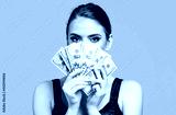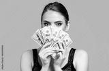Girl holding cash money in dollar banknotes. Woman holding lots of money in dollar currency. Luxury, beauty and money concept. Black and white