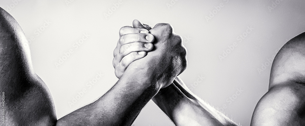 Rivalry, closeup of male arm wrestling. Two hands. Men measuring forces, arms. Hand wrestling, compete. Black and white