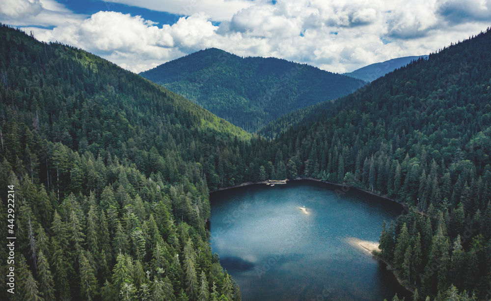 Lake Synevir framed by pine wood in Carpathian Mountains