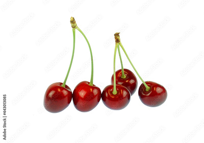close up on red cherries with green leaves