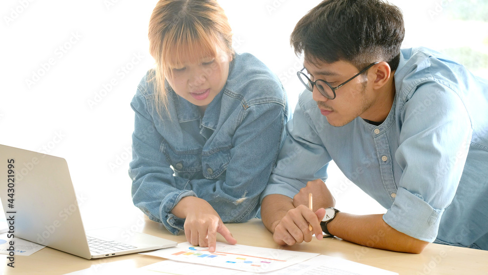 Young asian creative design meeting brainstorm ideas to plan and develop project together in office, Two asia small business startup coworker, colleagues working for the solution