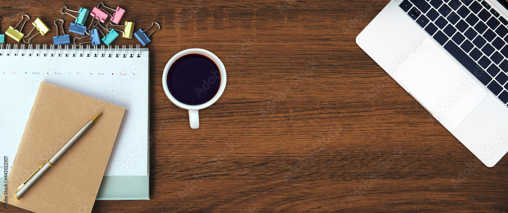 Top view desk with laptop and calendar with a book and office equipment for work area copy space and work from home or education school background concepts.