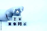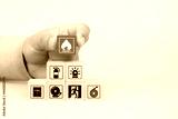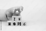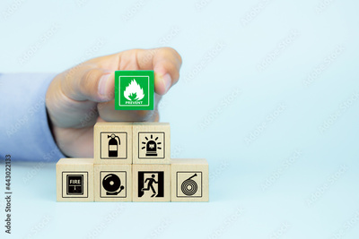 Fire, Hand choose cube wooden toy block stack with prevent icon with fire extinguisher and door exit and emergency bell symbol for fire hose reel protection for safety prevention and rescue.