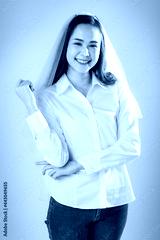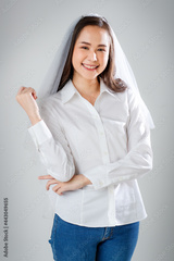 Portrait of young attractive Asian woman wearing white shirt and veil smiling at camera against white background. Concept for pre wedding photography. Isolated