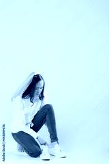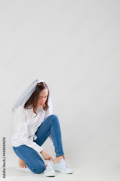 Portrait of young attractive Asian woman wearing white shirt and veil putting on white sneakers against white background. Concept for pre wedding photography. Isolate