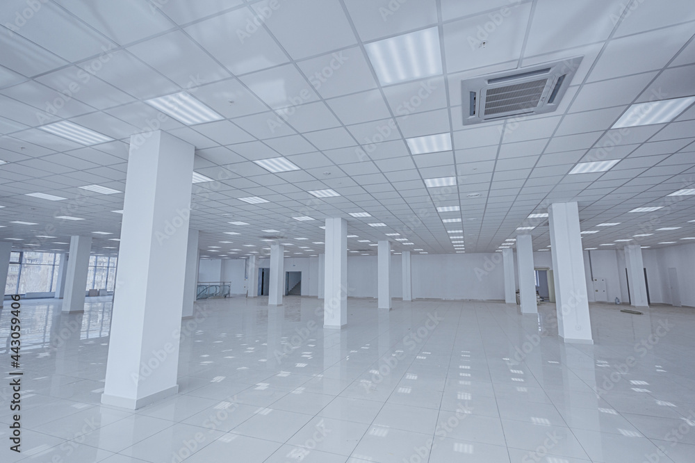 Spotlight and empty space. Empty office space in modern building. Interior of empty unfinished modern market. Architecture concept. Empty white room has white walls. Shopping center