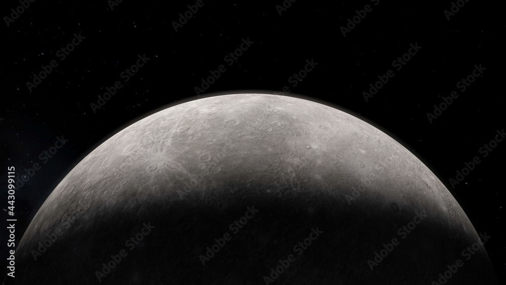 Vista desde el espacio de Mercurio con estrellas de fondo.