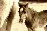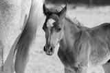 Horse mare and young pretty arabian foal on summer background, portrait closeup